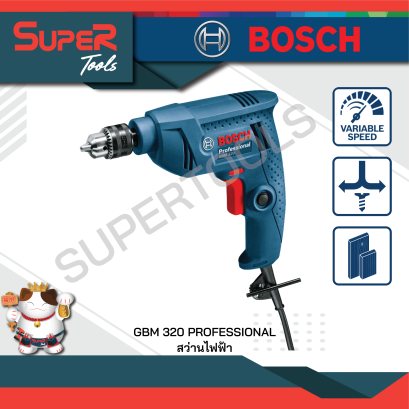 BOSCH สว่านไฟฟ้า 2 หุน (ปรับรอบ ซ้าย-ขวา) 4,200 รอบ 320 วัตต์ รุ่น GBM 320 ขนาดของหัวจับดอกต่ำสุด/สูงสุด: 6.5 มม. เส้นผ่าศูนย์กลางเจาะไม้ :13 มม