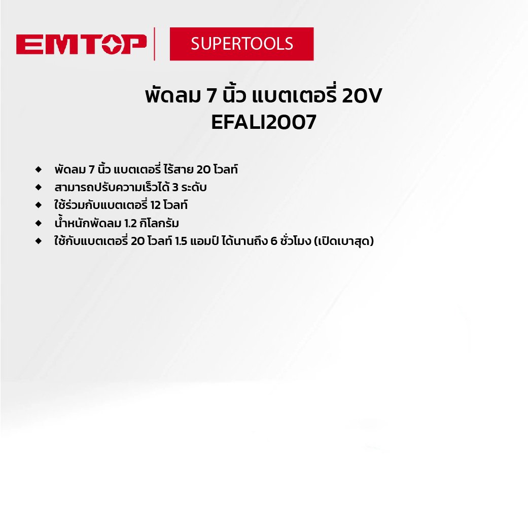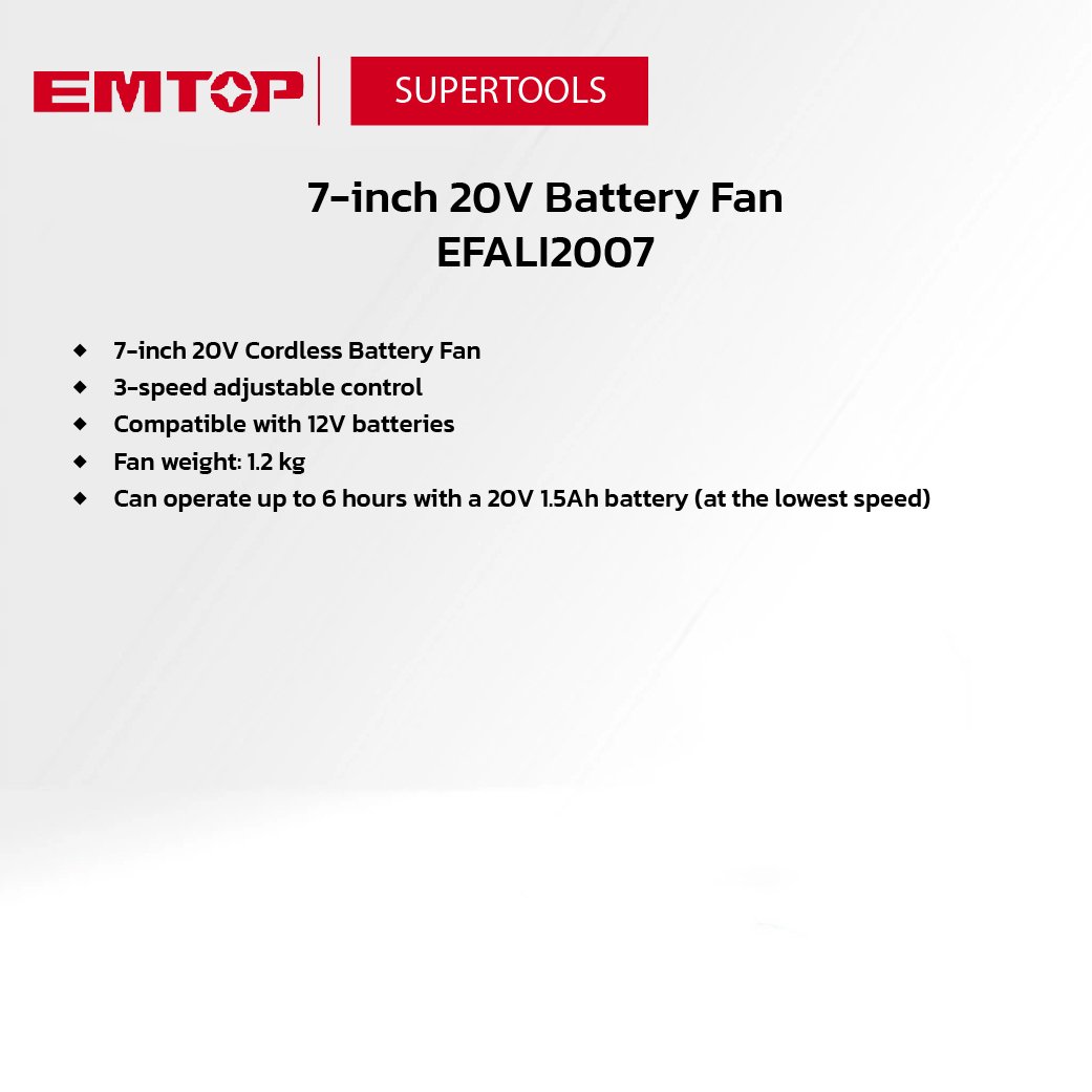 ◆ พัดลม 7 นิ้ว แบตเตอรี่ ไร้สาย 20 โวลท์ ◆ สามารถปรับความเร็วได้ 3 ระดับ ◆ ใช้ร่วมกับแบตเตอรี่ 12 โวลท์ ◆ น้ำหนักพัดลม 1.2 กิโลกรัม ◆ ใช้กับแบตเตอรี่ 20 โวลท์ 1.5 แอมป์ ได้นานถึง 6 ชั่วโมง (เปิดเบาสุด)